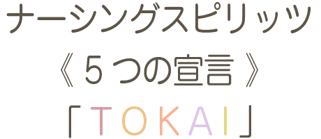 私たち看護部は、病院の使命と目標達成に努力し、人間性豊かな「愛の看護」の実践を宣言しています。ここで言う「愛」は、他者への満足と安全を保証することであり、その実践の指針として、「TOKAI」というキーワードを掲げています。